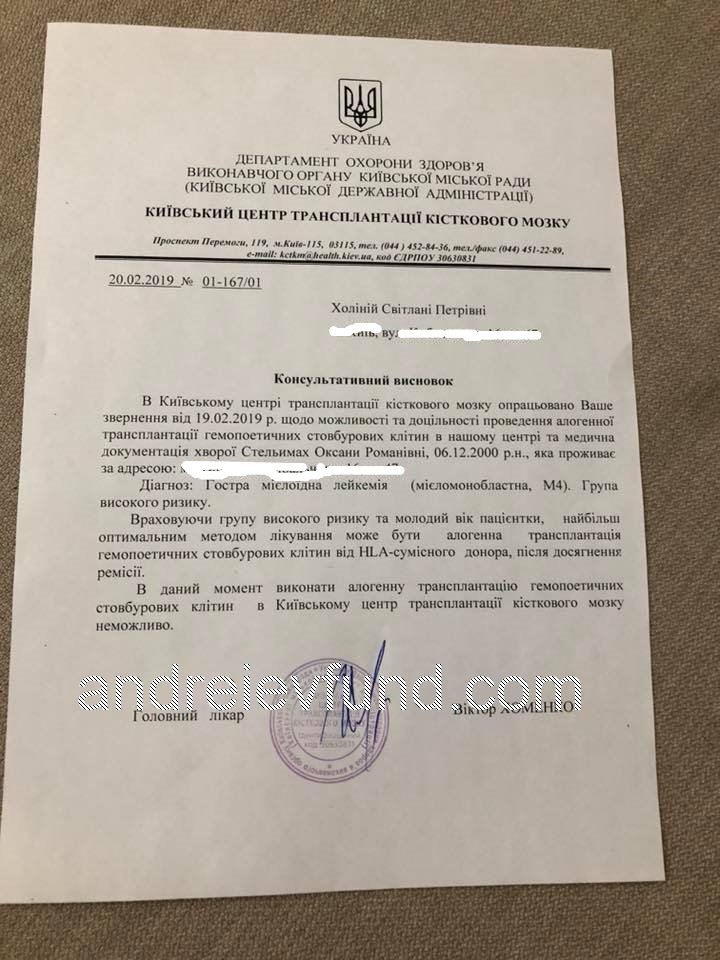 Потім був перевід до Національного інституту раку. Тут всі обстеження провели заново. Лікарі встановлюють остаточний діагноз – Гостра мієлоїдна лейкемія, група високого ризику. Ускладнюється стан пневмонією. Оксана знаходиться у реанімації. Лікарі констатують – після курсу хіміотерапії, щойно Оксана увійде в ремісію, потрібно терміново проводити трансплантацію кісткового мозку!